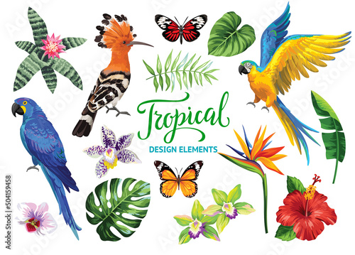 Tropical collection: exotic flowers, leaves, birds and butterflies. Vector isolated elements on the white background.
