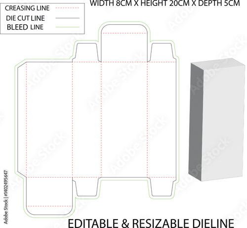 Box die cut. Realistic carton package blueprint layout. Tall rectangular food and medical pack. Isolated empty paper container mockup. Vector cardboard packaging template for branding