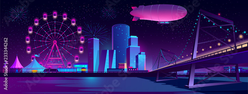 Vector urban concept background with night city illuminated with neon glowing lights. Festive cityscape with modern buildings, skyscrapers, amusement park with ferris wheel and firework on river bank