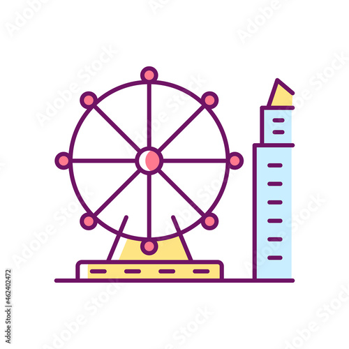 Singapore flyer RGB color icon. Large observation wheel. Amusement ride. Theme park. Giant ferris wheel. Tourist attraction in Singapore. Isolated vector illustration. Simple filled line drawing