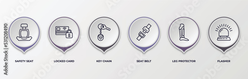 infographic template with outline icons. infographic for security concept. included safety seat, locked card, key chain, seat belt, leg protector, flasher editable vector.