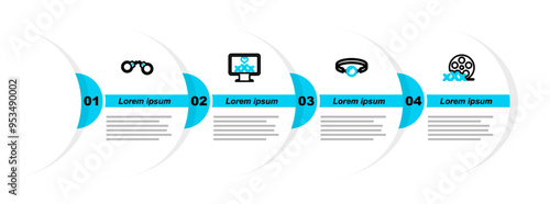 Set line Film reel with Sex, Silicone ball gag, Monitor 18 plus content and Handcuffs icon. Vector