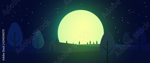 Beautiful night landscape panoramic composition with big moon, treers and hills. Vector fairy illustration in flat colorful style. Horisontal nature background.