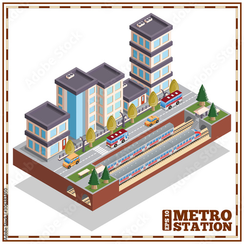 Metro station. Cityscape. Isometric. Isolated on white background. Vector illustration.