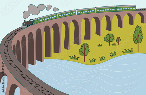 Traveling by train through nature landscape. Old brick bridge and river, transportation and tourism. Means of commuting. Flat cartoon, vector illustration