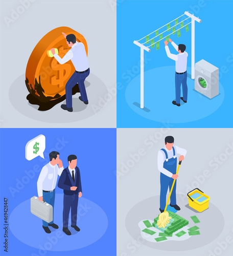 Money laundering and fraud isolated icons for infographics with criminal washing money, corruption concept, offshore, bank building, office people, coin, banknote, isometric vector illustration