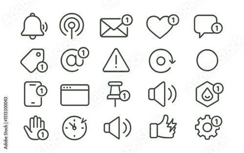 Line style icons of notifications and social alerts: notification bell, ping icon, new message alert, like notification, comment alert, tag notification, mention ping, alert badge, real-time update,