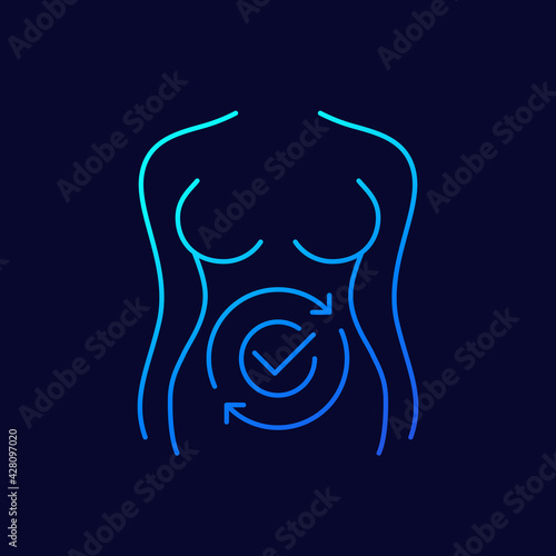 Woman Metabolism Line Icon. Female Good Digestion Linear Pictogram. Belly and Arrow Metabolism Concept Outline Icon. Editable Stroke. Isolated Vector Illustration