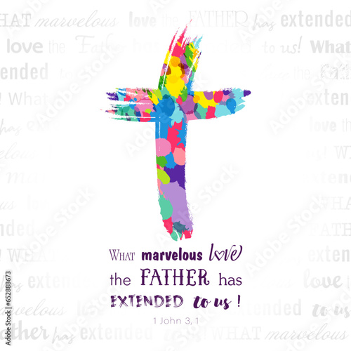 Creative colorful cross and Holy Bible quote 1 John 3,1. Greeting card concept. T shirt graphic. Church banner. Religious logo design. Modern typography. Brushing spots backdrop with clipping mask.