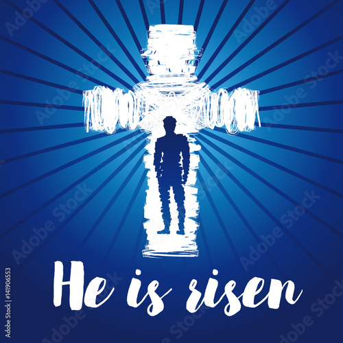 Hi is risen card. Vector invitation. Easter Sunday. Jesus is the door illustration. Shiny cross and resurrection up Jesus Christ. Isolated abstract graphic design template