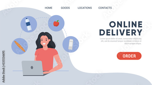 Woman with laptop ordering food delivery online. Flat vector illustration.