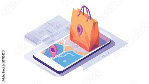 Isometric illustration depicting a smartphone displaying a map with location markers. A brown shopping bag with a location marker rests on top of the phone, suggesting online ordering and delivery.