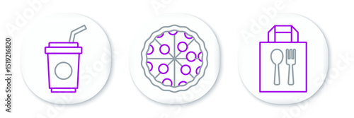 Set line Online ordering and delivery, Paper glass with straw and Pizza icon. Vector