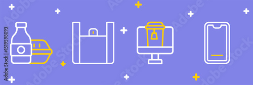Set line Online ordering and delivery, Canned fish and Sauce bottle icon. Vector