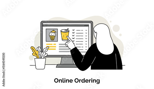 Female customer selecting food items from an online menu displayed on a computer monitor. Viewing food and beverage choices for online ordering at a cafe.