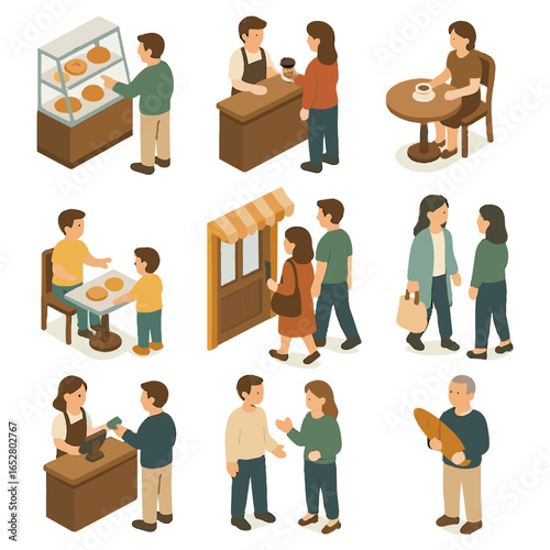 Flat vector icons of customer café moments: working on laptop, reading book with coffee, group chatting at table, person ordering at counter, barista serving smile, couple with coffee cups, quiet