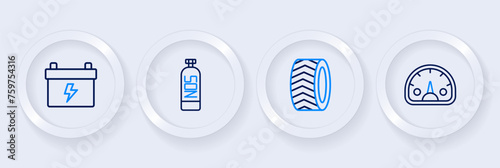 Set line Speedometer, Car tire wheel, Wrench spanner and Nitrous oxide icon. Vector