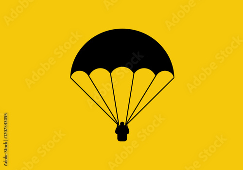 A black silhouette of a person parachuting against a solid yellow background