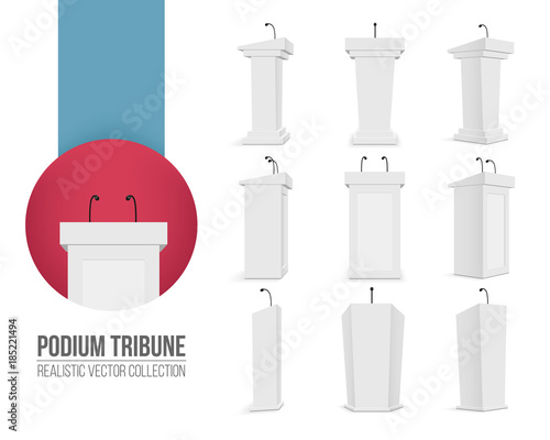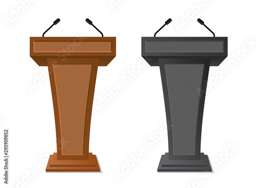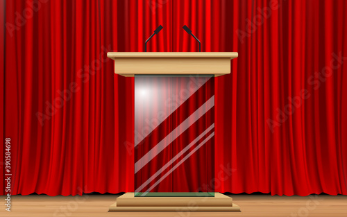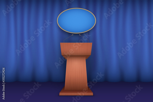 Podium rostrum with microphone for debate, speech, press conference, dispute, audience. Podium tribune with empty place for speaker, lecture.Isolated stage stand for debate.vector