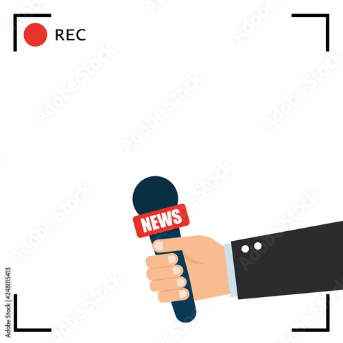 Journalist hand holding microphones performing interview. Vector illustration of microphone for breaking news, broadcasting live. Audience, reportage and communication