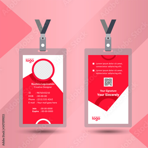 Vector template of  ID card with strap. Abstract illustration for identity card. Design with bright gradient and geometric figures for exhibition or business conference. Two sided authentication pass.