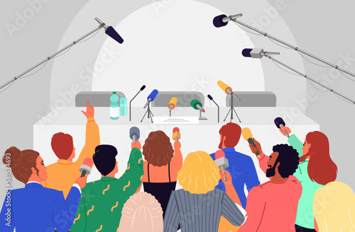 Press conference interview table and microphones. Vector public or mass media event for tv and radio journalists, interview, news report, politics debate or presentation. Cartoon press conference room