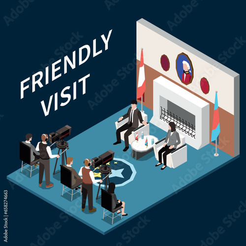 Isometric stand for press conference with microphones, equipped place for the speaker in front of journalists. Audience listens to the lecturer at the conference hall