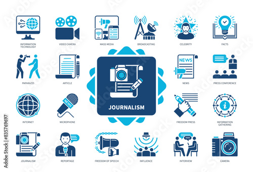 Journalism icon set. Paparazzi, News, Reportage, Broadcasting, Interview, Mass Media, Influence, Freedom of Speech. Duotone color solid icons