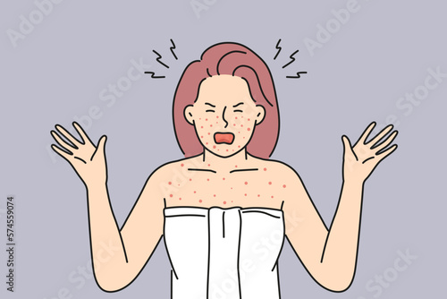 Angry woman in towel shout distressed with red body inflammation. Furious female anxious with allergy reaction or dermatitis. Vector illustration.