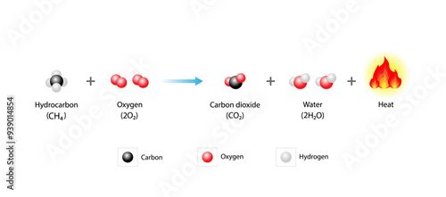 Combustion reaction. Chemical reaction. Hydrocarbon and oxygen reaction to produce carbon dioxide, water and heat. Experiment explanation. Scientific vector illustration.