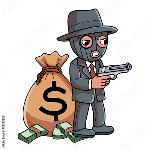 Cartoon style illustration of bank robbery. Theft in bank.