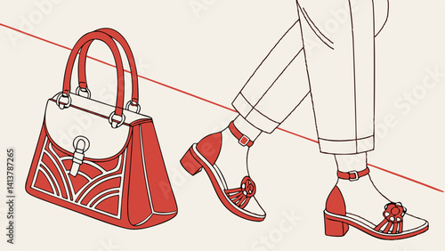 A minimalist line art illustration of a person walking in stylish dark blue sandals and flowing pants