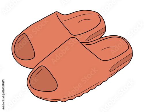 Women's summer slides illustration isolated on white background. Pair of brown leather sandals with crisscross straps. Casual open-toe flat footwear for beach, travel, vacation.