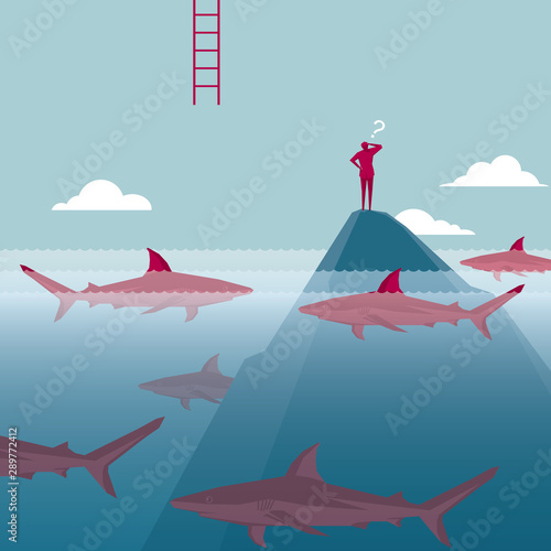 Man caught in a net trap and hung up. Vector illustration depicts concept of trap, tangled, problem, helpless, restrained, tricked, crisis, and entangled.