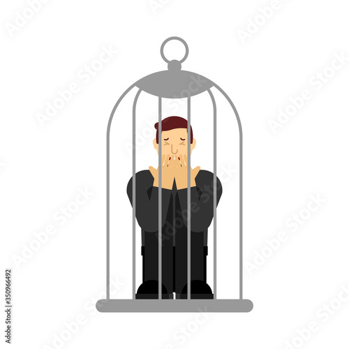 Vector of a businessman working at desk trapped inside birdcage being observed by managers