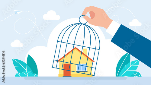 The locked house inside the cage. Hand lifting a cage of house. The concept of rent, credit, seizure of real estate. Removal of restrictions, fines. Real estate concept. Vector flat illustration
