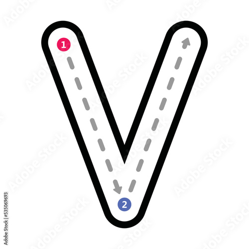 Tracing Alphabet uppercase capital letter V prewriting dotted line element for kindergarten, preschool and Montessori school kids worksheet for handwriting practice activity.