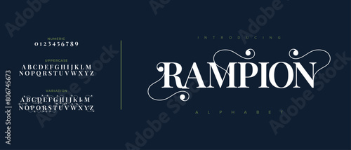 Rampion elegant font alphabet uppercase lowercase and number. Classic lettering minimal fashion designs. Typography modern serif fonts regular decorative vintage concept. Vector illustration