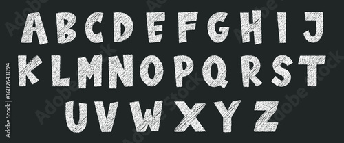 White chalk uppercase letters in hand-drawn sketch style on dark blackboard background. Textured crayon font perfect for school themes, playful designs, or educational materials.