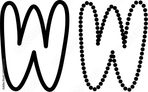 Vector illustration of uppercase letter W in bold outline and dashed line style. Ideal for kids' tracing worksheets, coloring pages, and educational materials.