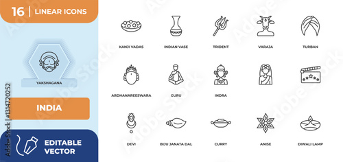 outline icons set - india concept. yakshagana, kanji vadas and more.