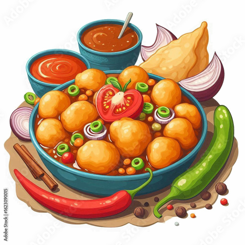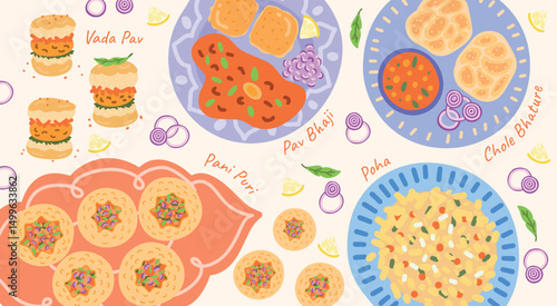 Traditional Indian Food and Dishes. Colorful restaurant illustrations. Pani puri, Pav bhaji, Vada pav, Chole bhature, Poha. Vector illustration for festivals, restaurant posters, menu and cafe.