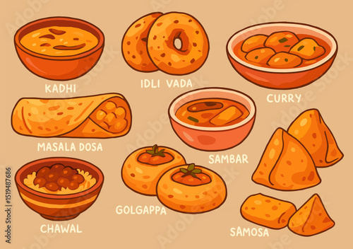 Colorful indian cuisine illustration set