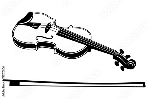Classic black violin and bow hand drawn vector illustration. Isolated musical concert instrument in flat style for icon or logo.
