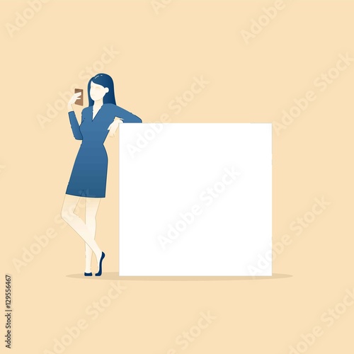 Drawing of casual woman standing and leaning on huge giant cell phone with empty white screen template. Single continuous line art