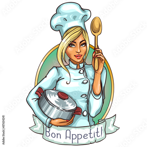 Cute and kawaii female chef or baker with white board cartoon manga chibi vector character design