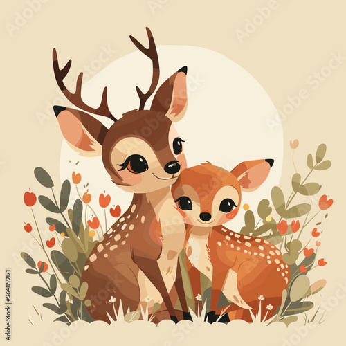 Two deer are sitting in a field of flowers