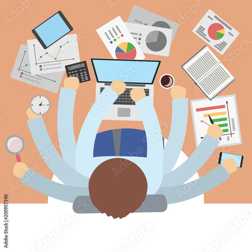 Multitask office work vector illustration. Cartoon flat busy businessman character working on many virtual business tasks. Multitasking concept, modern effective time management isolated on white