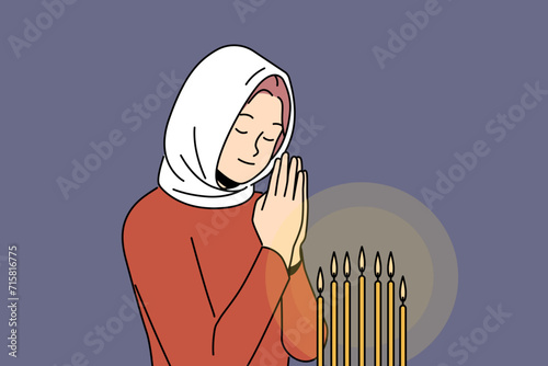 Praying catholic woman in christian cassock and headscarf kneels in different positions during worship in church. Praying nun repents to god for previously committed sins, performing religious ritual