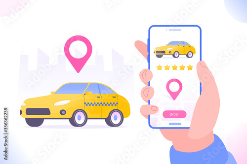 Renting cars concept. Car rent app carshare transport payment with smartphone auto driver sharing taxi search vector background. Illustration of car rent service, carsharing app mobile